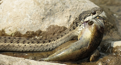 Direkt am Ufer überraschten wir eine kleine Wasserschlange, die eine Mühlkoppe im Maul hatte. Wir pirschten uns ran und konnten es nicht fassen, wie sich dieses kleine Schlangenmaul nach und nach über den Kopf des Fisches stülpte und ihn dann komplett durch Muskelbewegungen millimeterweise in den Schlangenkörper würgte. Das Reptil war sich offensichtlich ganz sicher, dass catch&release für Mühlkoppen am Wind River nicht vorgeschrieben ist :))
